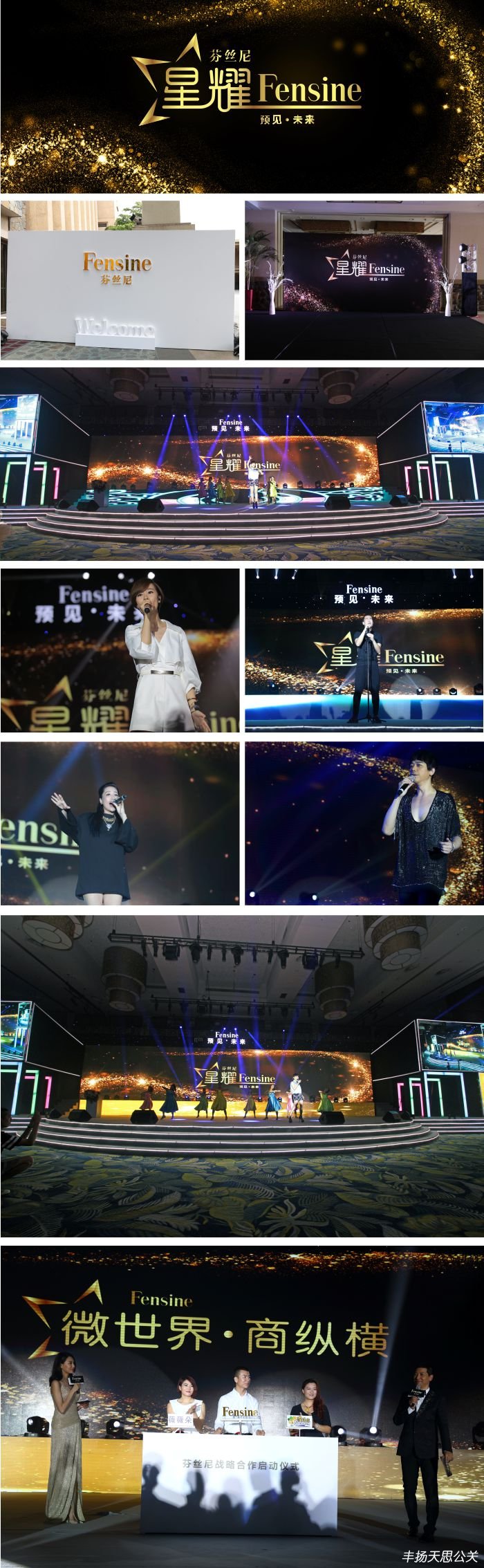 當晚一千多名優秀經銷商和各位領導、明星一起為芬絲尼慶生,晚會節目豐富,精彩紛呈。在當紅小天后吳莫愁熱辣開場后,芬絲尼周年慶典暨明星盛宴正式拉開帷幕。當晚邀請到戴軍、李斯羽兩名著名主持人主持盛會,會上,芬絲尼CEO伊斌先生回顧芬絲尼成立一年以來的歷程,預見芬絲尼未來的發展。芬絲尼年度品牌代言人張馨予小姐也來到現場正式與芬絲尼簽約,并在現場1000多名來賓的見證下為芬絲尼新品——駐顏修護蠶絲面膜的發布揭幕。