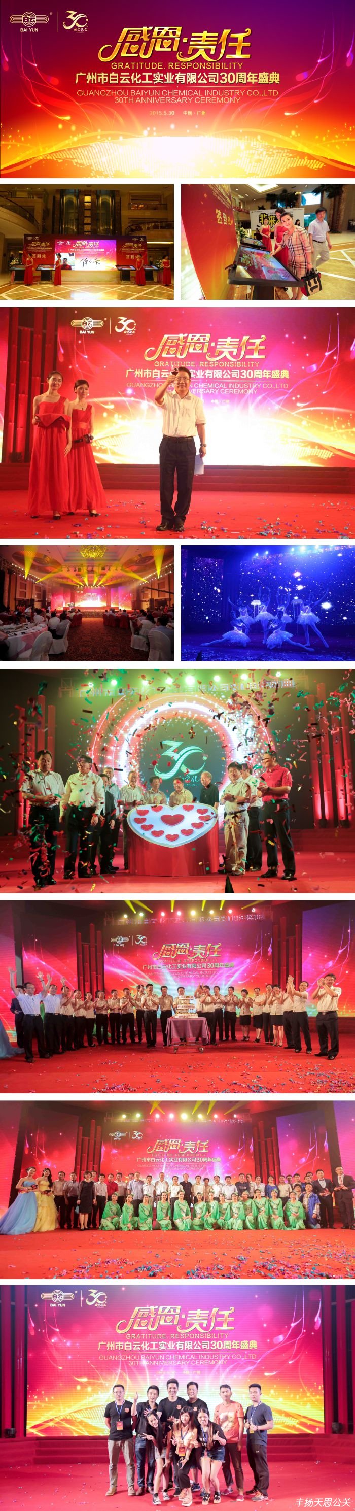 2015年5月30日,由豐揚天思品牌公關策劃及執行的“感恩·責任——廣州市白云化工實業有限公司30周年盛典在廣州華鉅君悅酒店隆重舉行。包括行業領導、專家、顧客、供應商、經銷商等500多位海內外嘉賓蒞臨本次盛宴,共同見證、分享了白云化工與行業各界風雨相伴、責任同行的奮進30年!