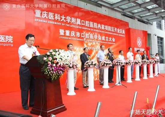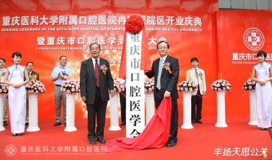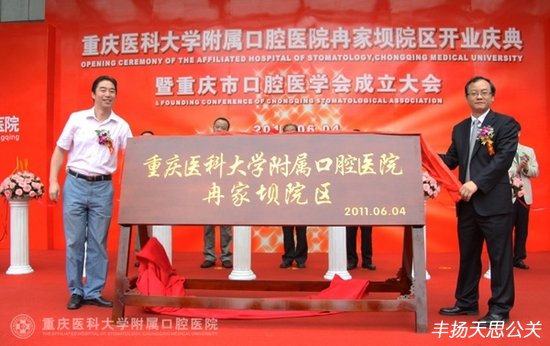 2011年6月4日上午,重慶醫科大學附屬口腔醫院冉家壩院區開業慶典暨重慶市口腔醫學會成立大會在冉家壩院區隆重舉行。重慶市政府副市長吳剛、中華口腔醫學會會長王興、重慶市衛生局黨組書記夏永鵬、重慶醫科大學黨委書記吳小翎等領導出席了開業儀式并剪彩。參加開業慶典暨重慶市口腔醫學會成立大會的嘉賓還有中華口腔醫學會王渤秘書長、北京大學口腔醫院張祖燕副書記、四川大學華西口腔醫院趙志河副院長、首都醫科大學王松靈副校長、武漢大學口腔醫學院樊明文院長等全國各大口腔醫院和醫學院的院長、專家、知名學者和院老專家、職工代表共200余人。重慶市衛生局局長屈謙主持了開業典禮。