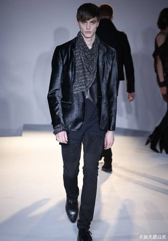 簡陋的混凝土空間和照明,襯托服裝的堅硬感與熟悉感。黑色皮革機(jī)車外套、標(biāo)志性的格子圖案,絲綢及花呢材質(zhì)等讓人聯(lián)想到“朋克”。整個系列的特殊之處在于精致細(xì)小的金屬鏈,成為男女裝的聯(lián)系點,既有堅硬又伴隨柔軟的雙重內(nèi)涵。